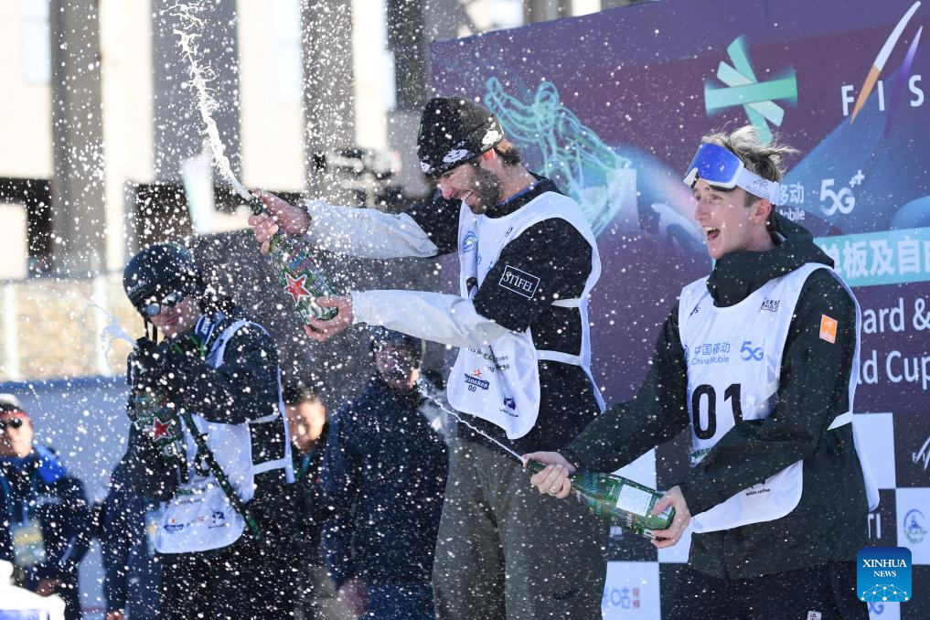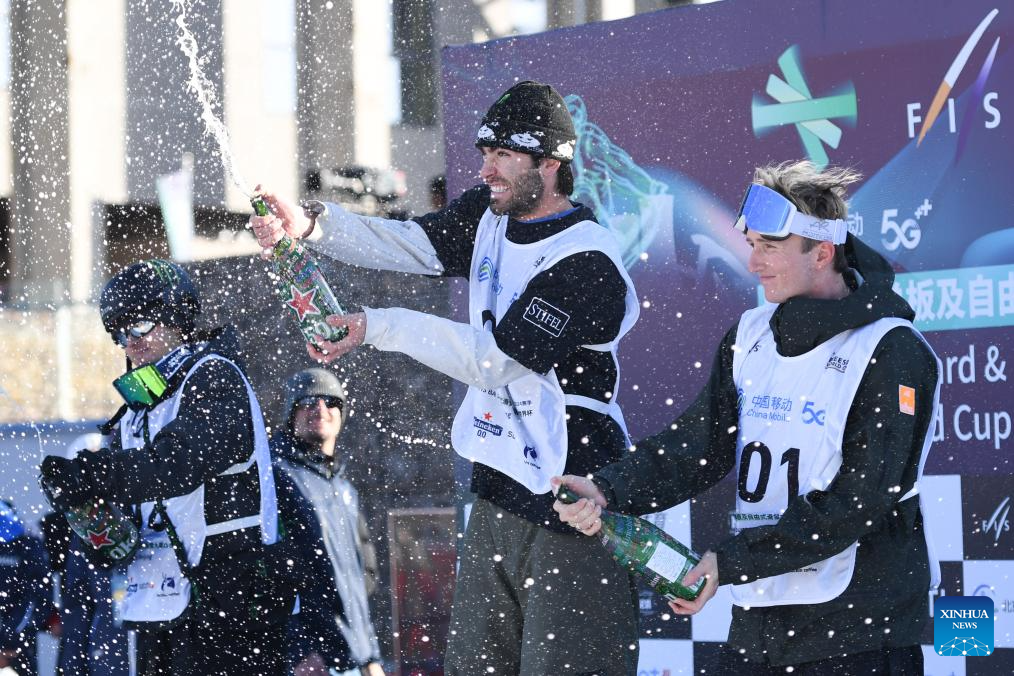 Gold medalist Alexander Hall (C) of the United States, silver medalist Edouard Therriault (L) of Canada and bronze medalist Andri Ragettli of Switzerland celebrate in champagne shower during the awarding ceremony after the men's freeski big air final at the FIS Snowboard and Freeski Big Air World Cup at Big Air Shougang in Beijing, capital of China, Dec. 2, 2023. (Xinhua/Ju Huanzong)