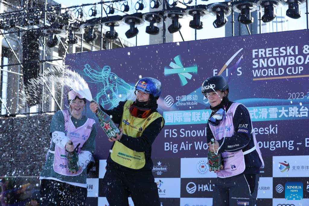 Mathilde Gremaud (C) of Switzerland celebrates with Kirsty Muir (L) of Britain and Flora Tabanelli of Italy during women's freeski big air final at the FIS Snowboard and Freeski Big Air World Cup at Big Air Shougang in Beijing, capital of China, Dec. 2, 2023. (Xinhua/Ju Huanzong)