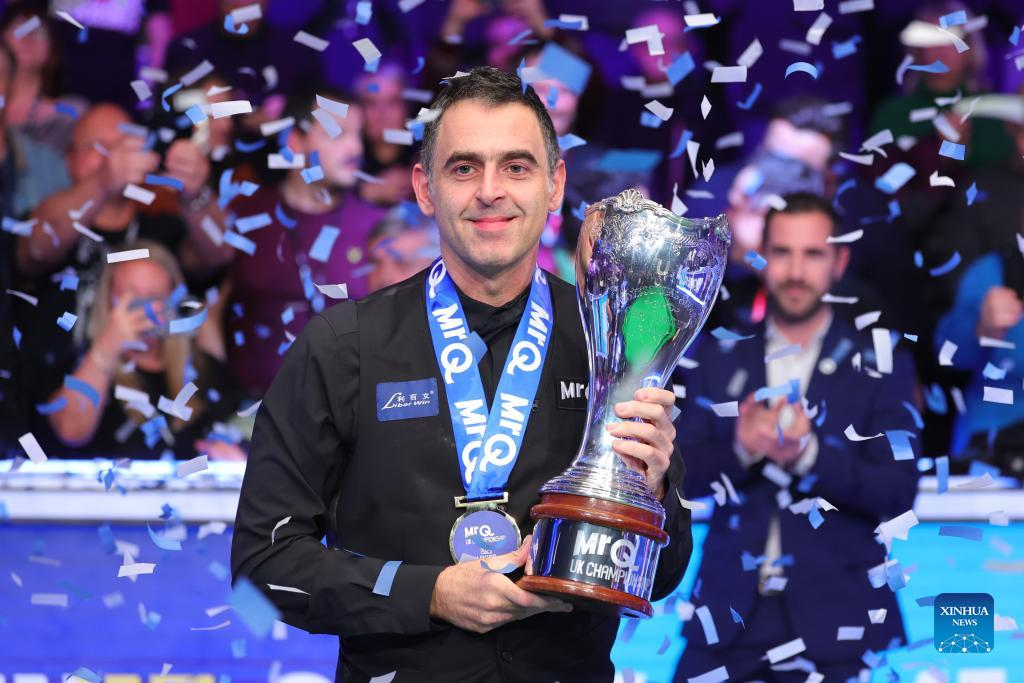 Ronnie O'Sullivan of England celebrates with the trophy after the final match between Ronnie O'Sullivan of England and Ding Junhui of China at 2023 UK Snooker Championship in York, Britain, Dec. 3, 2023. (Photo by Zhai Zheng/Xinhua)