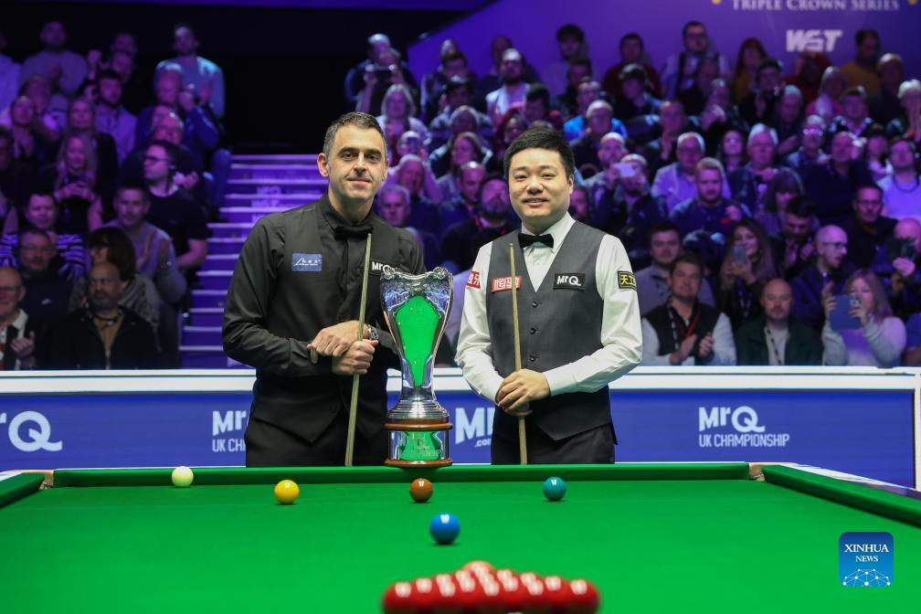 Ronnie O'Sullivan (L) of England and Ding Junhui of China pose before the final match between Ronnie O'Sullivan of England and Ding Junhui of China at 2023 UK Snooker Championship in York, Britain, Dec. 3, 2023. (Photo by Zhai Zheng/Xinhua)