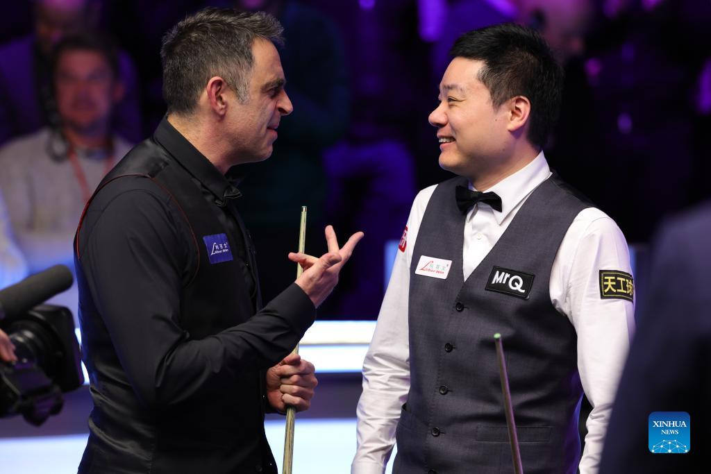 Ronnie O'Sullivan (L) of England greets Ding Junhui of China after the final match between Ronnie O'Sullivan of England and Ding Junhui of China at 2023 UK Snooker Championship in York, Britain, Dec. 3, 2023. (Photo by Zhai Zheng/Xinhua)