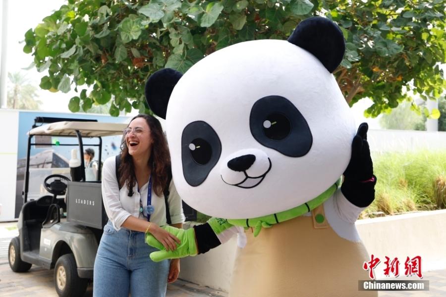 A participant poses for photos with an eye-catching panda mascot at the China Pavilion during the 28th session of the Conference of the Parties (COP28), in the Expo City of Dubai, the United Arab Emirates, Dec. 2, 2023. (Photo: China News Service/Han Haidan)