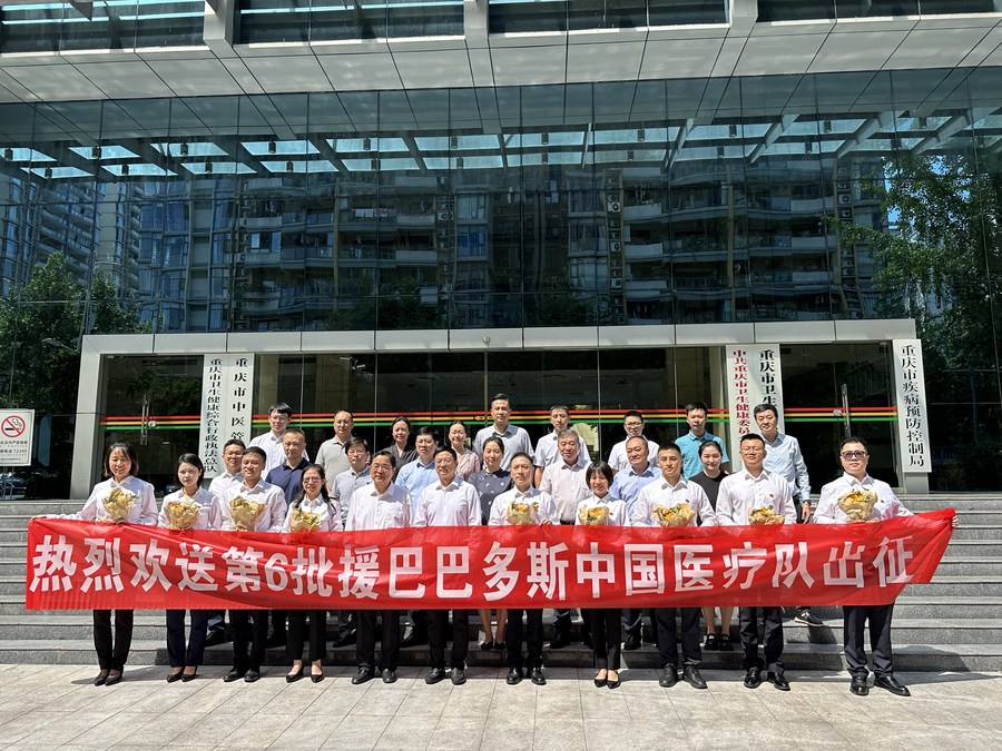 Members of a medical team pose for a group photo before departure for Barbados to provide medical aid, in southwest China's Chongqing Municipality, Sept. 8, 2023. (Xinhua)