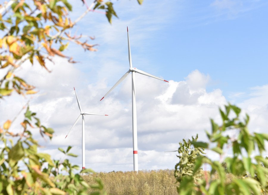 This photo taken on Oct. 14, 2023 shows wind turbines in Brandenburg, Germany. (Xinhua/Ren Pengfei)