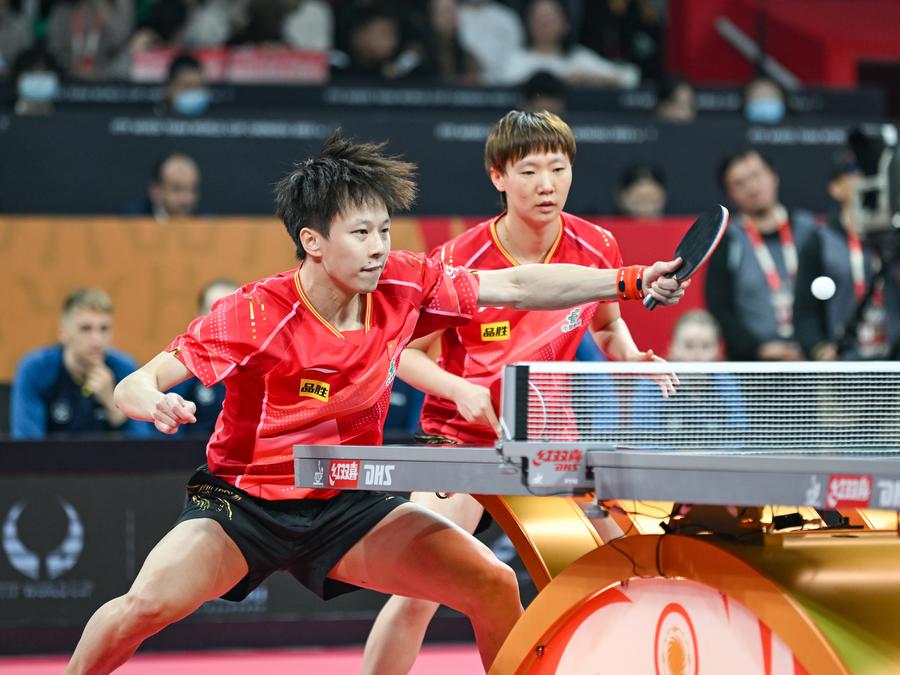 Lin Gaoyuan (L) and Wang Manyu in action during the Stage 1 Group 1 mixed doubles match against Kristian Karlsson and Christina Kallberg of Sweden at the 2023 ITTF Mixed Team World Cup in Chengdu, southwest China's Sichuan Province, Dec. 4, 2023. (Xinhua/Wang Xi)