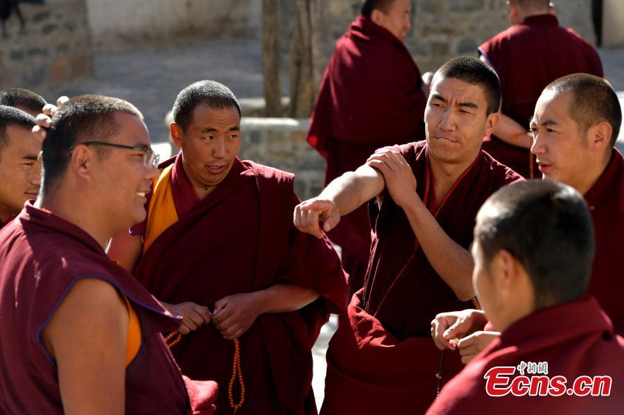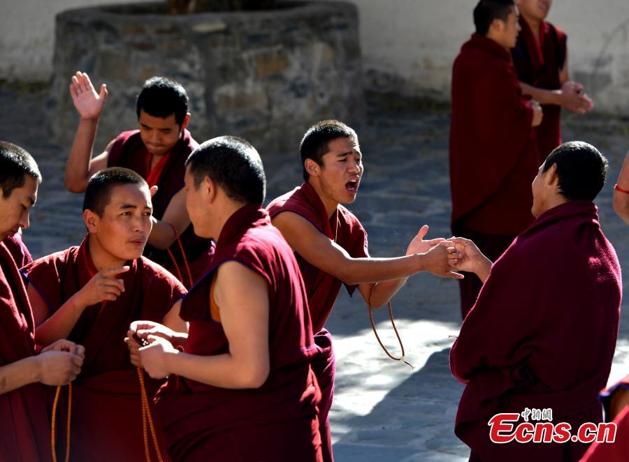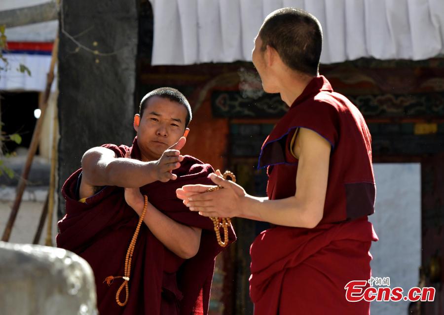 Buddhist monks participate in a scriptural debate, a unique way of learning in Tibetan Buddhism, at the Tashilhunpo Monastery in Xigaze, southwest China's Tibet Autonomous Region, Dec. 4, 2023. (Photo: China News Service/Li Lin)