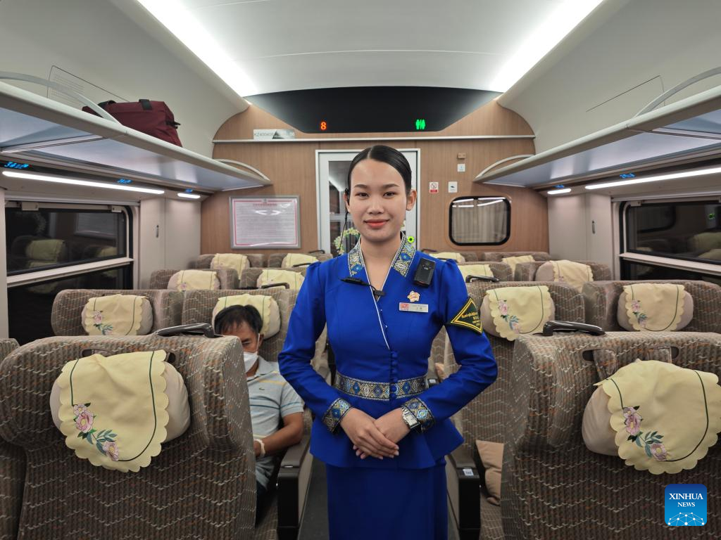 VIENTIANE, Dec. 5 (Xinhua) -- At the age of 20, Lao girl Bounmee already became the breadwinner for her family. As the chief conductor of a bullet train on the China-Laos Railway, she now earns a salary way more than her peers.
