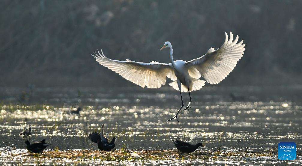 An egret flies over a river in Tengzhou City, east China's Shandong Province, Dec. 5, 2023. (Photo by Li Zhijun/Xinhua)