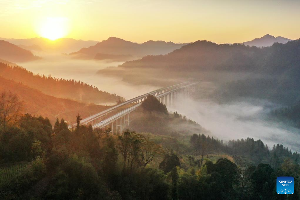 This aerial photo taken on Dec. 5, 2023 shows the scenery in Bunadong Village of Longshan County, central China's Hunan Province. (Photo by Zeng Xianghui/Xinhua)