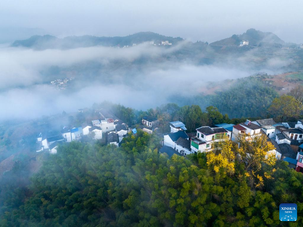 This aerial photo taken on Dec. 5, 2023 shows the scenery in Poshan Village, Shexian County of Huangshan City, east China's Anhui Province. (Photo by Fan Chengzhu/Xinhua)