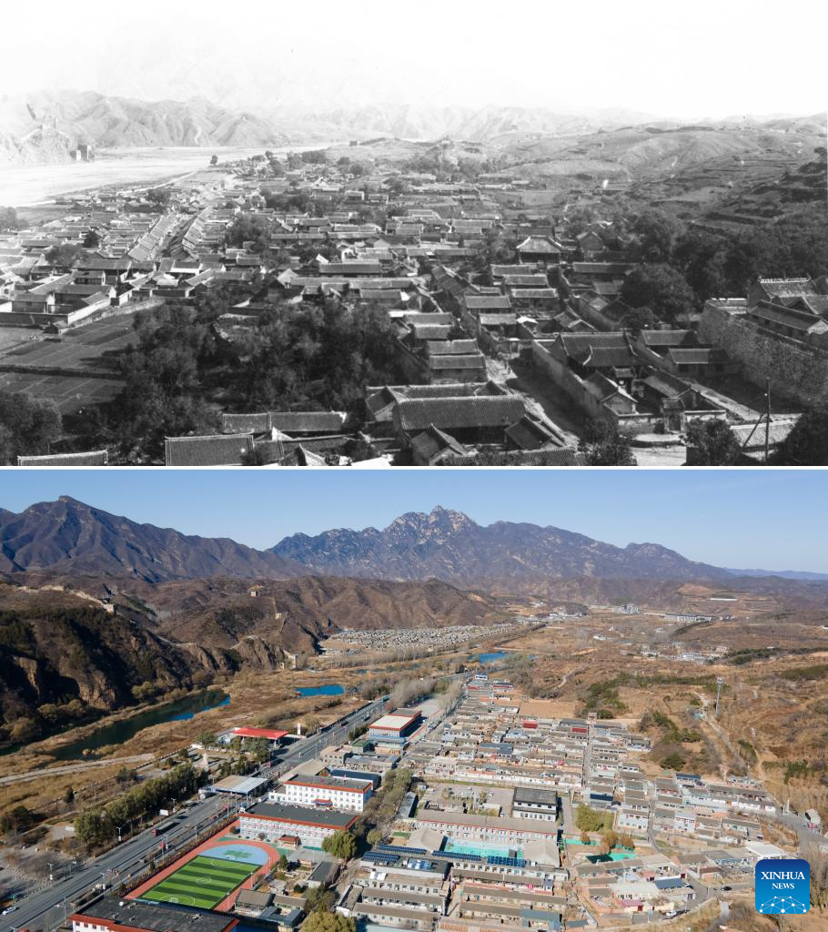 This combo photo shows the Gubeikou before the Chinese People's War of Resistance against Japanese Aggression (file photo, above) and the Gubeikou Town (aerial photo taken on Nov. 14, 2023 by Chen Zhonghao, below). (Xinhua)