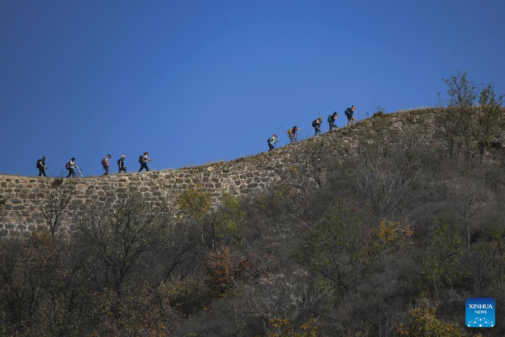 Foreign tourists climb the Panlongshan section of the Gubeikou Great Wall in Beijing, capital of China, Oct. 24, 2023. (Xinhua/Chen Zhonghao)