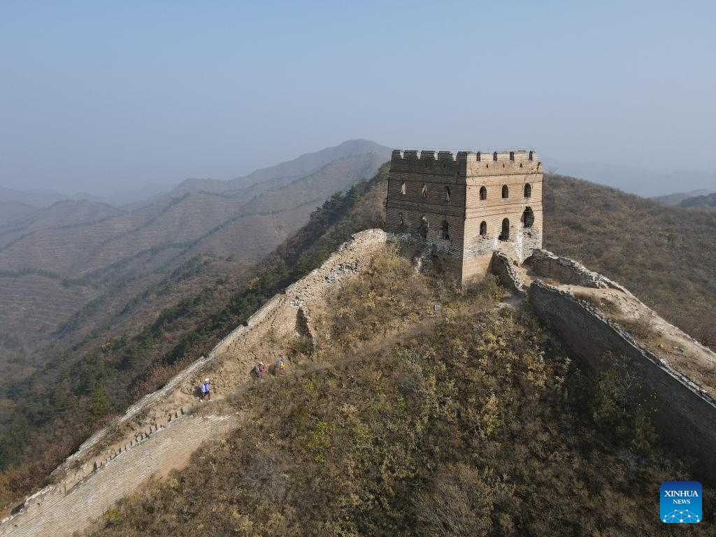 This aerial photo taken on Oct. 24, 2023 shows people climbing the Panlongshan section of the Gubeikou Great Wall in Beijing, capital of China. (Xinhua/Xia Zilin)