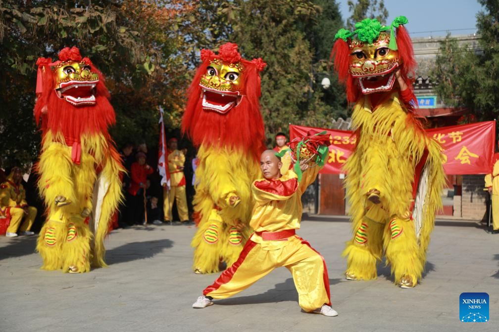People perform lion dance at a temple fair at the Gubeikou Great Wall in Beijing, capital of China, Oct. 28, 2023. (Xinhua/Xia Zilin)