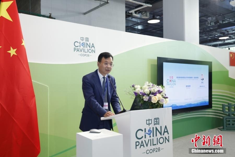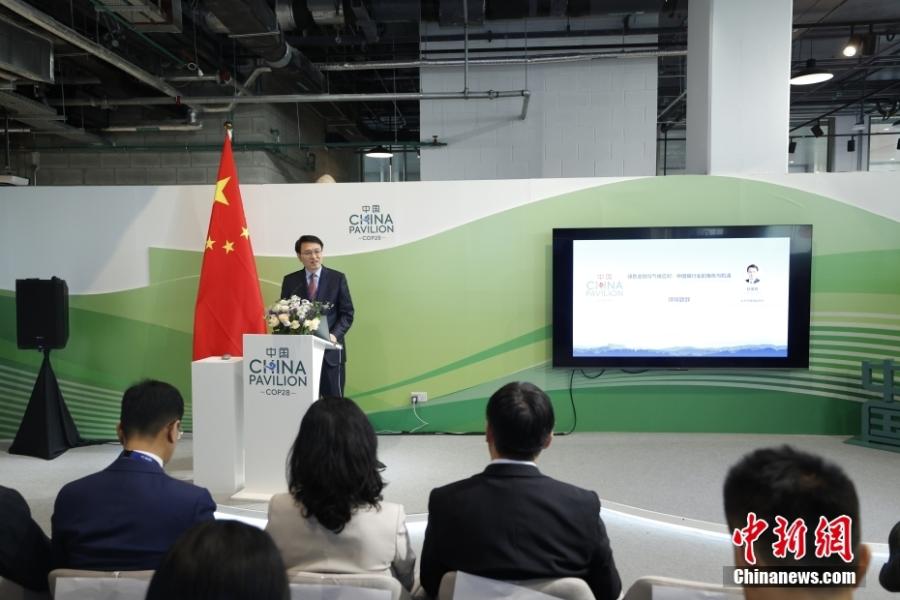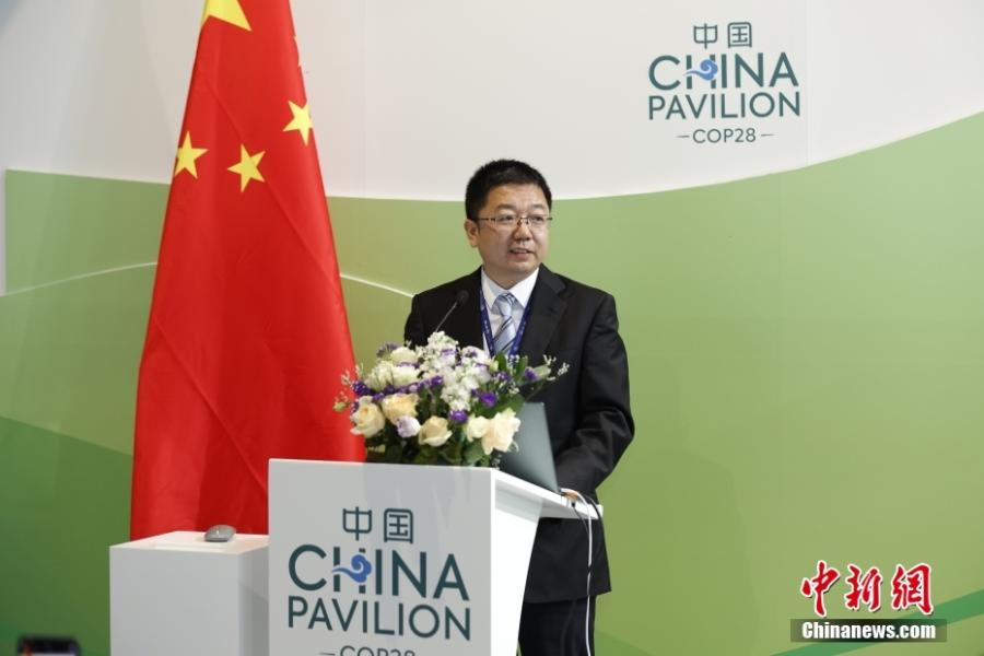 Hu Jun, deputy party secretary of Policy Research Center for Environment and Economy (PRCEE), Ministry of Ecology and Environment, PRC, delivers a speech at a side event on green finance and climate change during the 28th Conference of the Parties to the United Nations Framework Convention on Climate Change (COP28) held in Dubai, the United Arab Emirates, Dec. 5, 2023. (Photo: China News Service/Han Haidan)