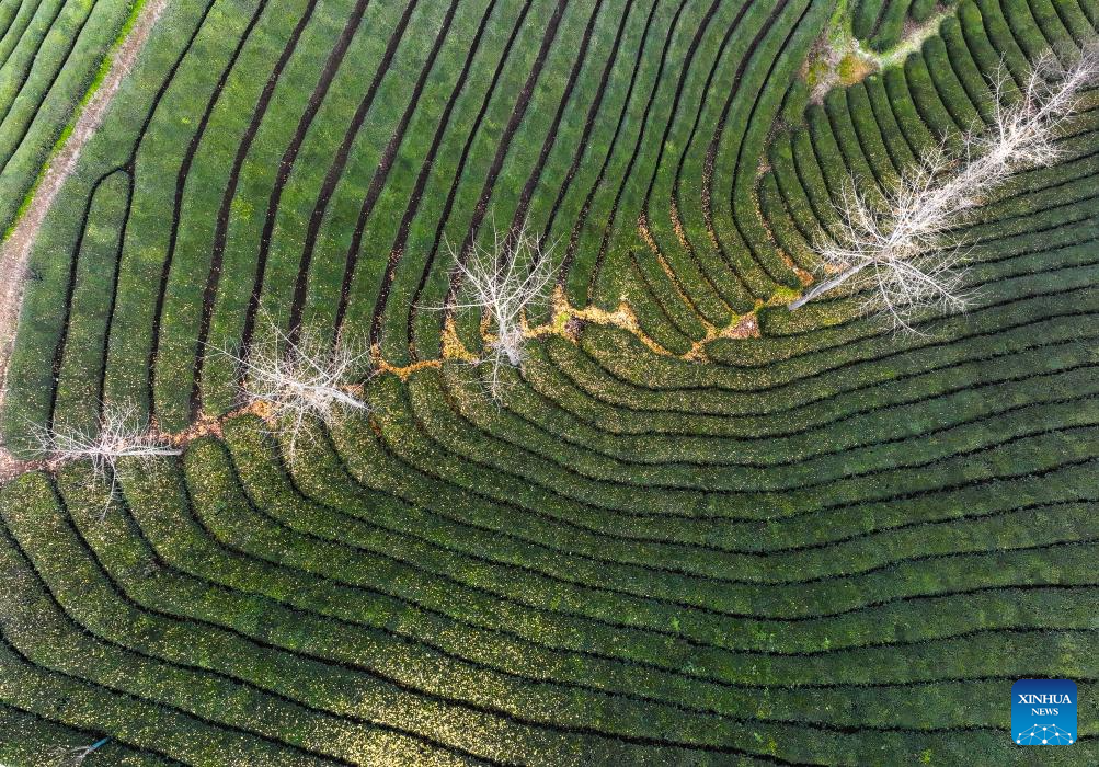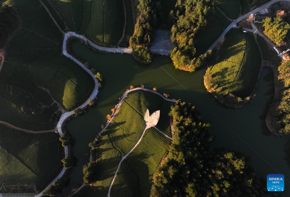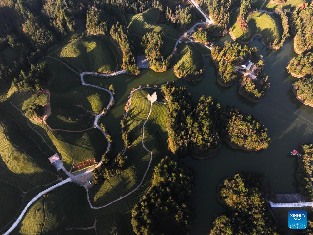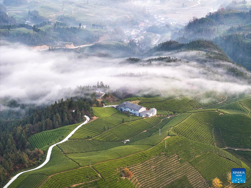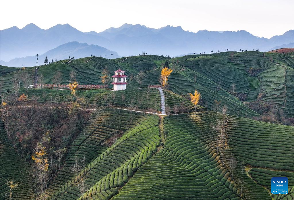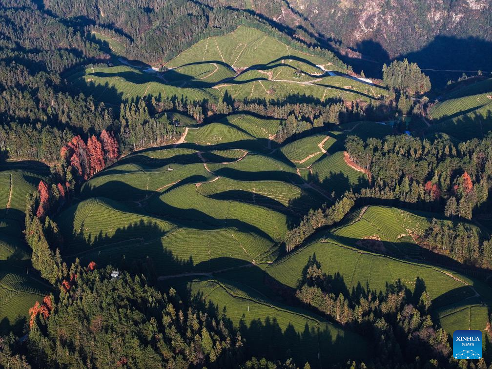 This aerial photo taken on Dec. 6, 2023 shows the scenery of a tea garden in Zouma Township of Hefeng County, Enshi Tujia and Miao Autonomous Prefecture, central China's Hubei Province. (Xinhua/Yang Wenbin)