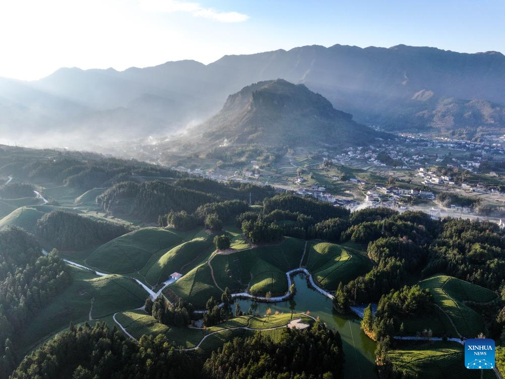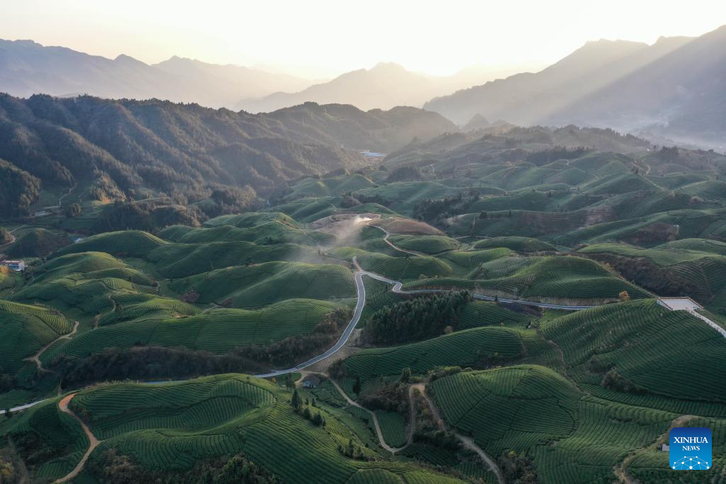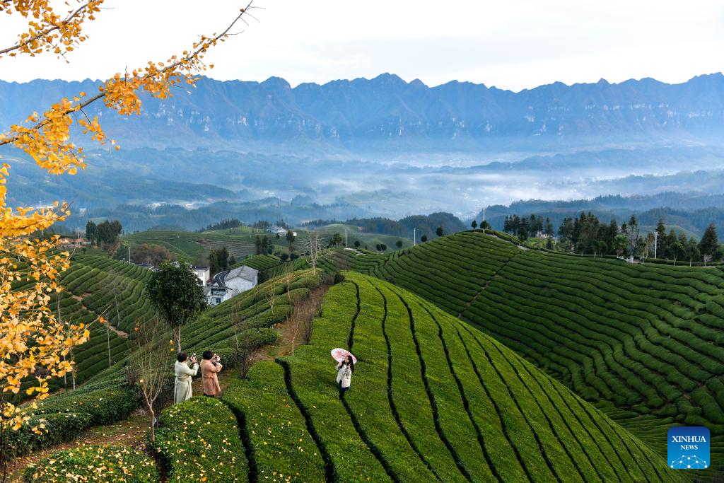 Tourists visit a tea garden in Zouma Township of Hefeng County, Enshi Tujia and Miao Autonomous Prefecture, central China's Hubei Province, Dec. 6, 2023. (Xinhua/Yang Wenbin)