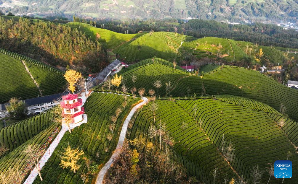 This aerial photo taken on Dec. 5, 2023 shows the scenery of a tea garden in Zouma Township of Hefeng County, Enshi Tujia and Miao Autonomous Prefecture, central China's Hubei Province. (Xinhua/Yang Wenbin)