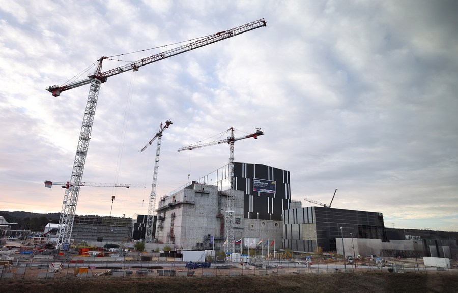 This photo taken on Nov. 24, 2023 shows the assembly building on the construction site of the ITER Tokamak, the world's largest fusion experiment machine, in Saint-Paul-lez-Durance, France. (Xinhua/Gao Jing)