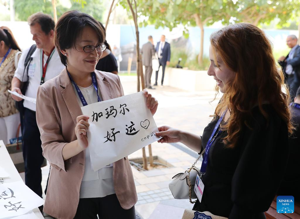 A staff member demonstrates Chinese calligraphy to an attendee at China's pavilion of the 28th session of the Conference of the Parties to the United Nations Framework Convention on Climate Change (COP28), in Dubai, the United Arab Emirates, Dec. 6, 2023. (Xinhua/Wang Dongzhen)