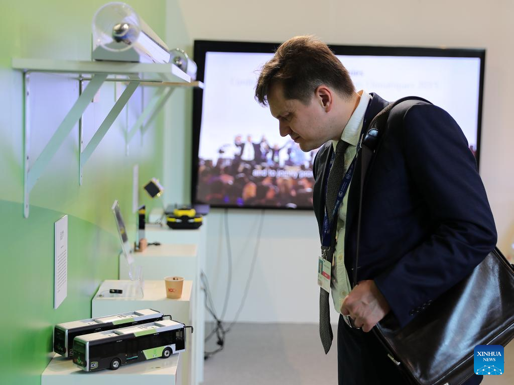 An attendee visits China's pavilion of the 28th session of the Conference of the Parties to the United Nations Framework Convention on Climate Change (COP28), in Dubai, the United Arab Emirates, Dec. 6, 2023. (Xinhua/Wang Dongzhen)