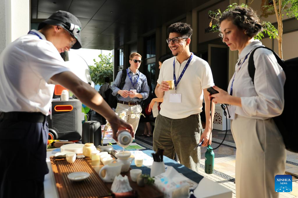 Attendees taste Chinese tea at China's pavilion of the 28th session of the Conference of the Parties to the United Nations Framework Convention on Climate Change (COP28), in Dubai, the United Arab Emirates, Dec. 6, 2023. (Xinhua/Wang Dongzhen)