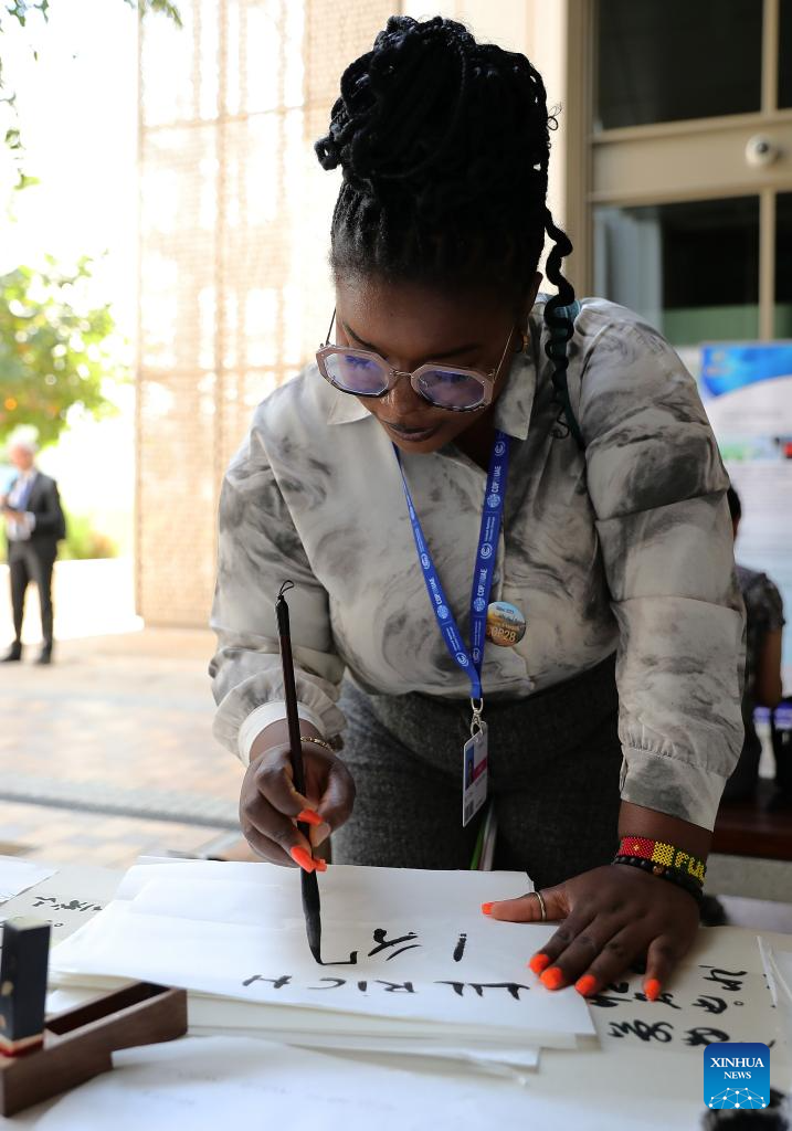 An attendee experiences Chinese calligraphy at China's pavilion of the 28th session of the Conference of the Parties to the United Nations Framework Convention on Climate Change (COP28), in Dubai, the United Arab Emirates, Dec. 6, 2023. (Xinhua/Wang Dongzhen)