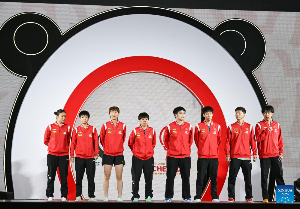 Players of China line up before the stage 2 match against Slovakia at the ITTF Mixed Team World Cup 2023 in Chengdu, southwest China's Sichuan Province, Dec. 6, 2023. (Xinhua/Wang Xi)