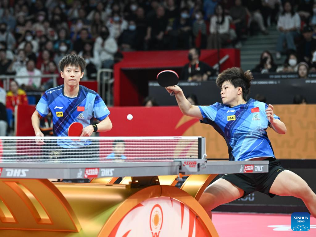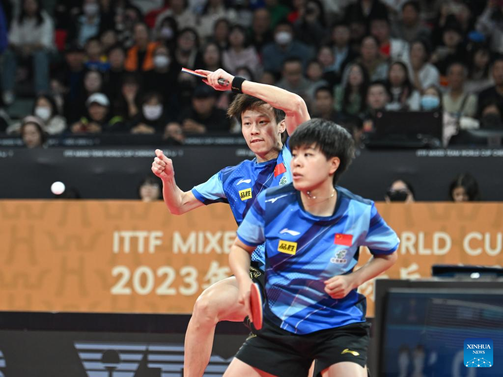 Lin Gaoyuan/Wang Yidi (R) of China compete during the stage 2 mixed doubles match against Jakub Zelinka/Tatiana Kukulkova of Slovakia at the ITTF Mixed Team World Cup 2023 in Chengdu, southwest China's Sichuan Province, Dec. 6, 2023. (Xinhua/Wang Xi)