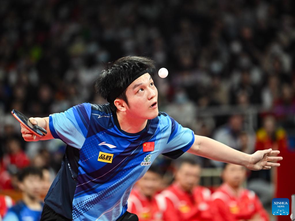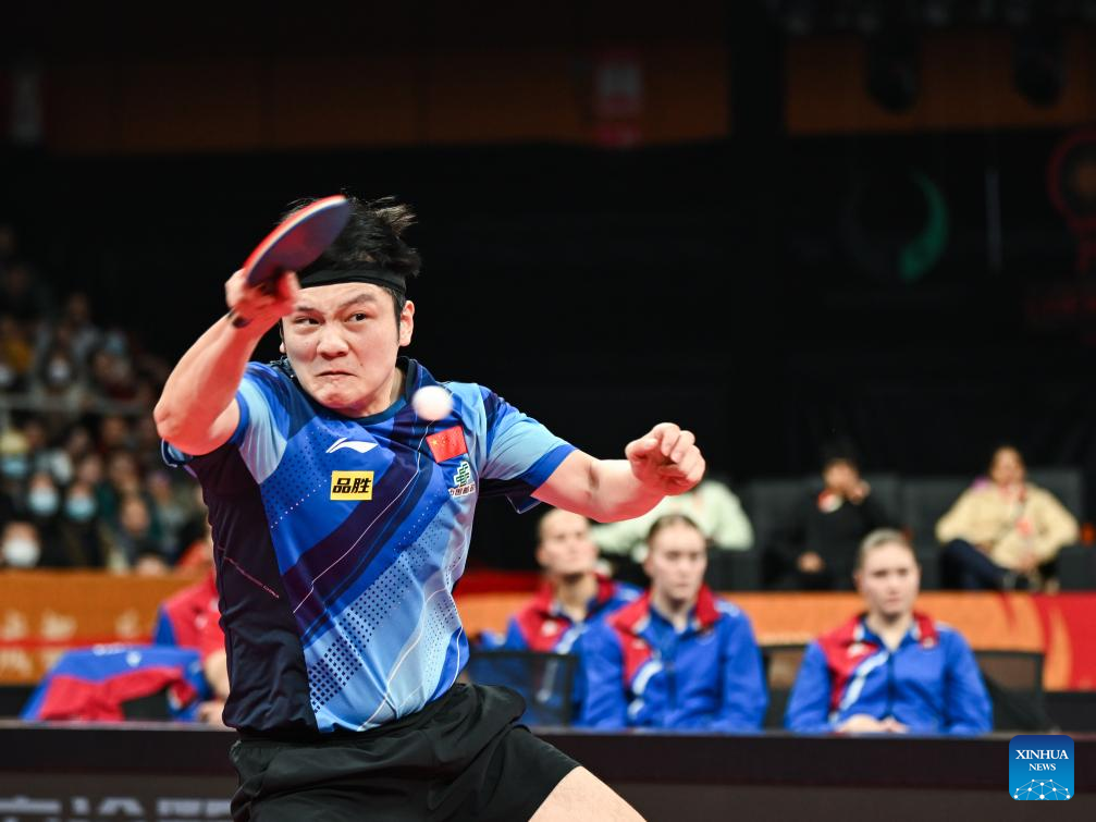 Fan Zhendong of China competes during the stage 2 men's singles match against Wang Yang of Slovakia at the ITTF Mixed Team World Cup 2023 in Chengdu, southwest China's Sichuan Province, Dec. 6, 2023. (Xinhua/Wang Xi)