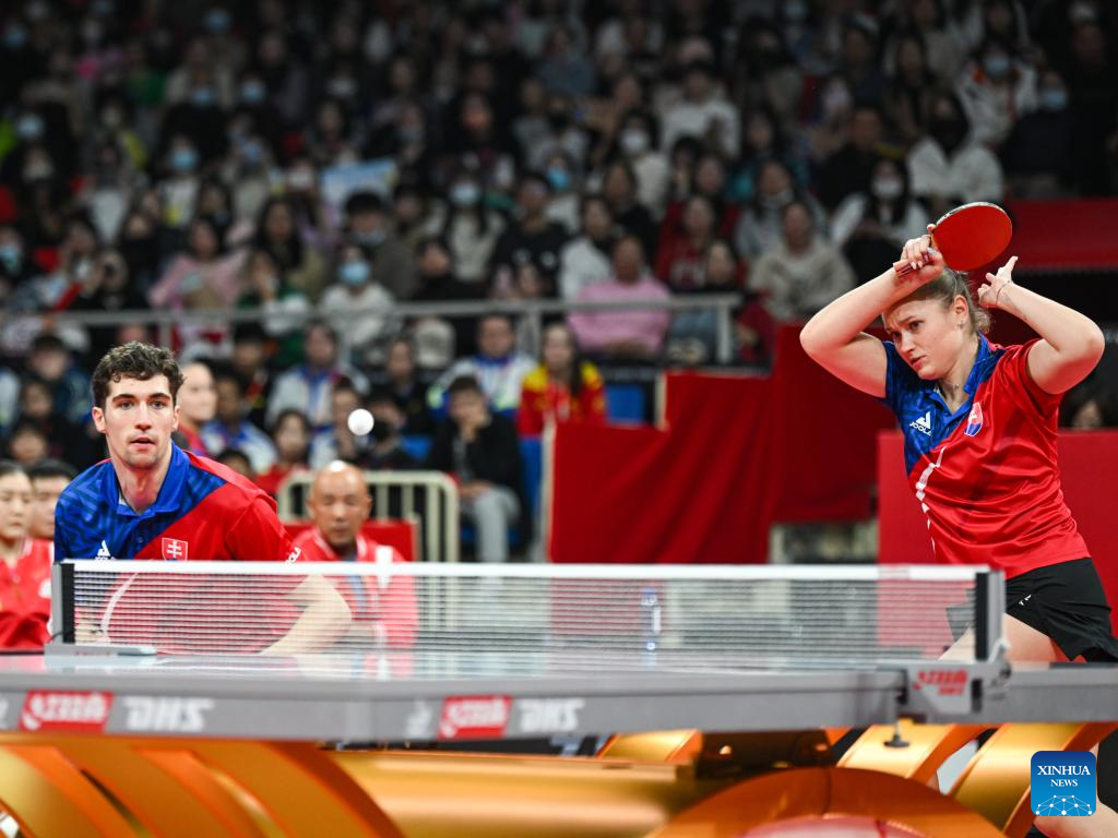 Jakub Zelinka/Tatiana Kukulkova (R) of Slovakia compete during the stage 2 mixed doubles match against Lin Gaoyuan/Wang Yidi of China at the ITTF Mixed Team World Cup 2023 in Chengdu, southwest China's Sichuan Province, Dec. 6, 2023. (Xinhua/Wang Xi)