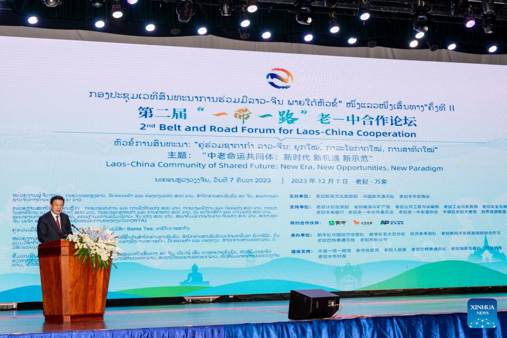 This photo taken on Dec. 7, 2023 shows the second Belt and Road Forum for Laos-China Cooperation held in Vientiane, Laos. The second Belt and Road Forum for Laos-China Cooperation kicked off here Thursday to discuss the implementation of the outcomes of the meeting between the top leaders of the two parties and the two countries, and the building of the China-Laos community with a shared future. (Xinhua/Zhu Wei)