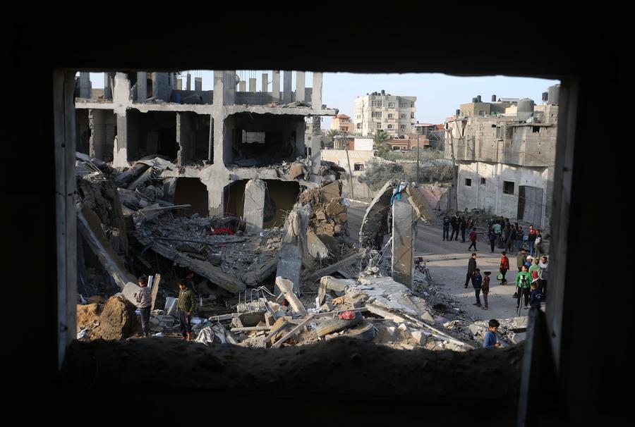 People inspect damage after an Israeli strike in the southern Gaza Strip city of Rafah, on Dec. 4, 2023. The Palestinian death toll has risen to 15,899 as a result of the Israeli attack on the Gaza Strip since Oct. 7, the Hamas-run health ministry said Monday. (Photo by Khaled Omar/Xinhua)