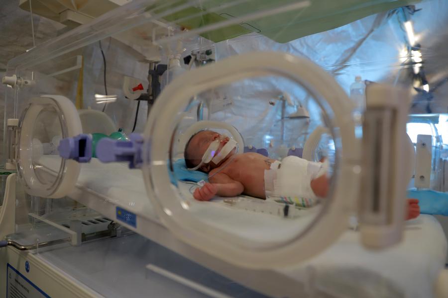 This photo taken on Dec. 2, 2023 shows an infant at a temporary hospital in the southern Gaza Strip city of Khan Younis. (Photo by Rizek Abdeljawad/Xinhua)