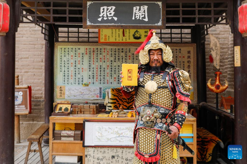 Li Sen, 43, earns a living by playing the role of an ancient "general" at the Jiayu Pass scenic area in the city of Jiayuguan, northwest China's Gansu Province. Visitors can buy ancient "visas" at his stall. These documents are designed by Li and form an essential part of the role-play, allowing tourists to travel back into ancient China.