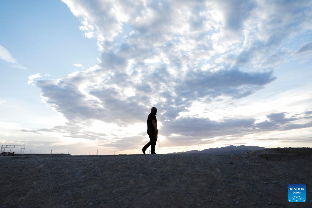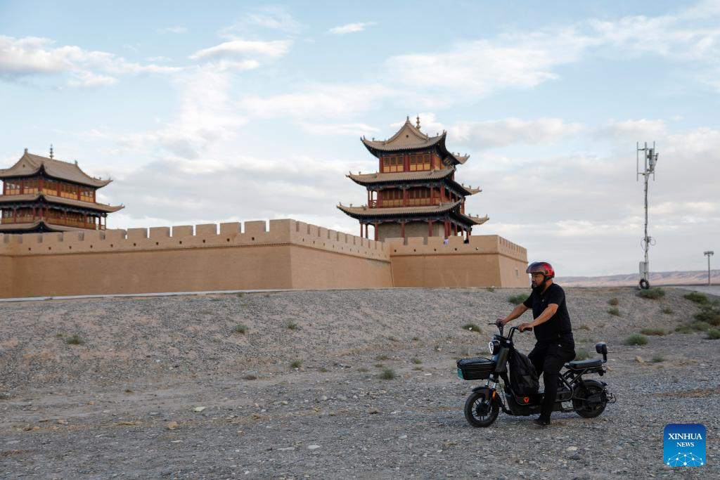 Li Sen leaves the Jiayu Pass scenic area after work in Jiayuguan City, northwest China's Gansu Province, July 14, 2023.
