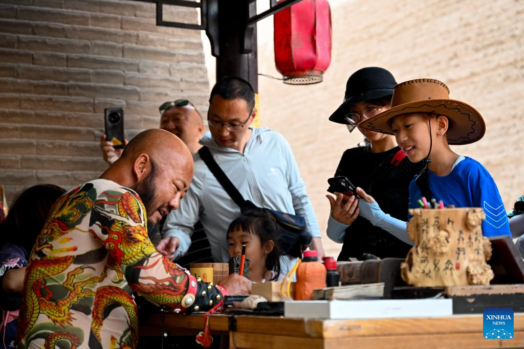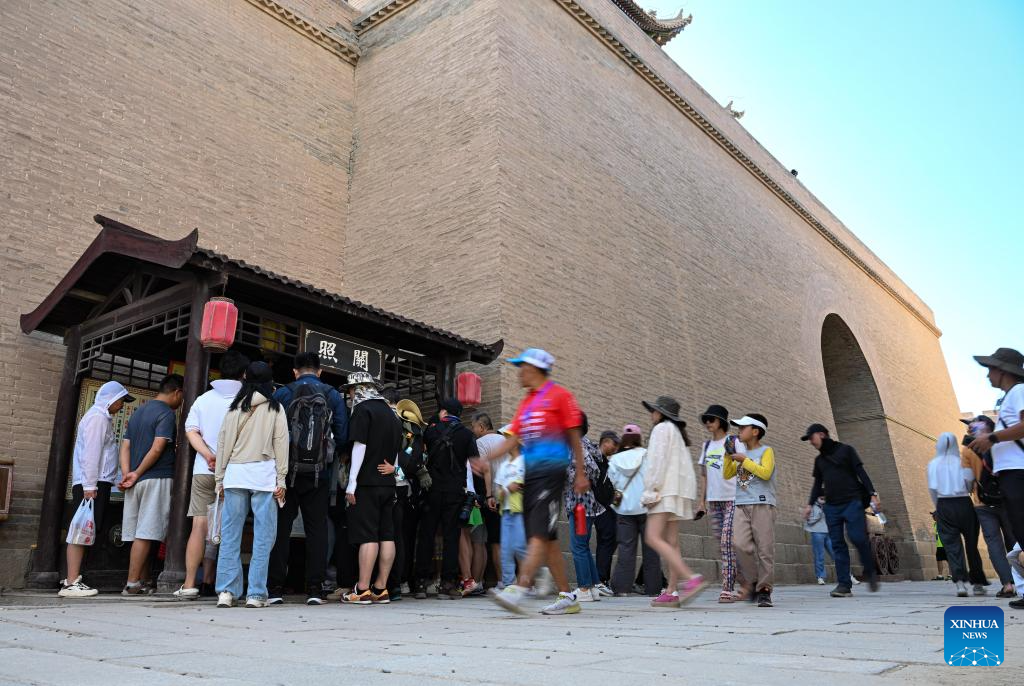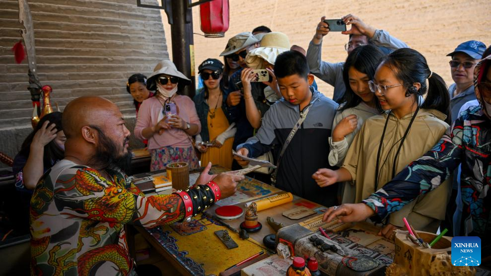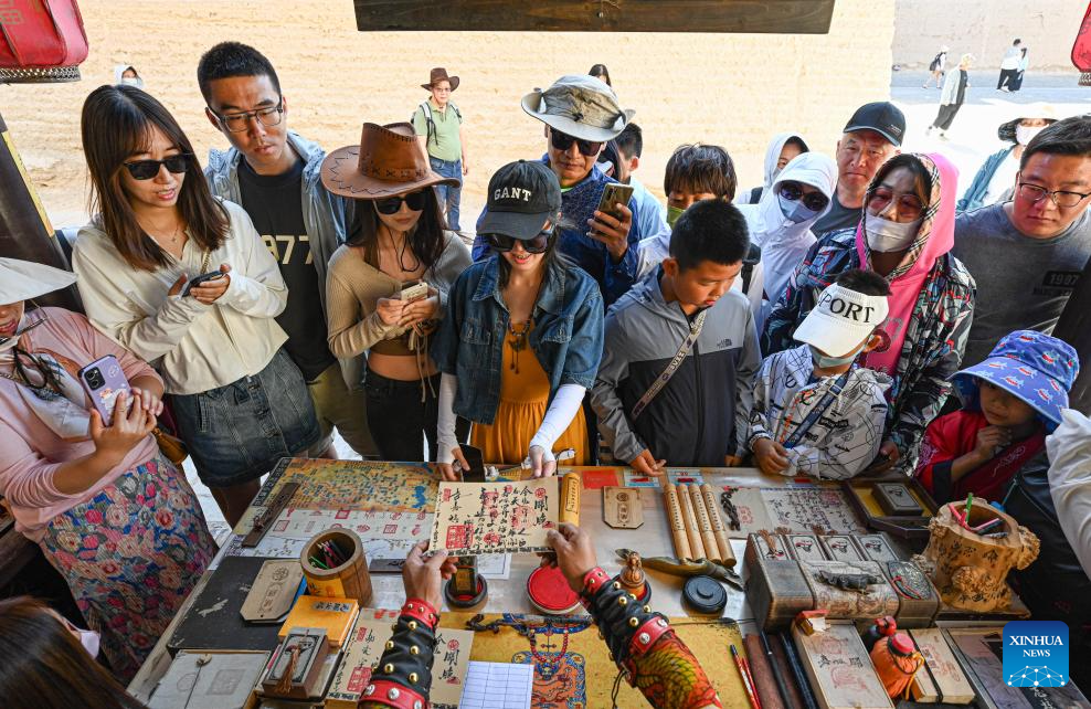 Visitors buy ancient "visas" at Li Sen's stall at the Jiayu Pass scenic area in Jiayuguan City, northwest China's Gansu Province, July 14, 2023.