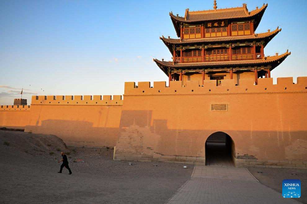 Li Sen (R) poses for a photo with a visitor at the Jiayu Pass scenic area in Jiayuguan City, northwest China's Gansu Province, Sept. 26, 2023.