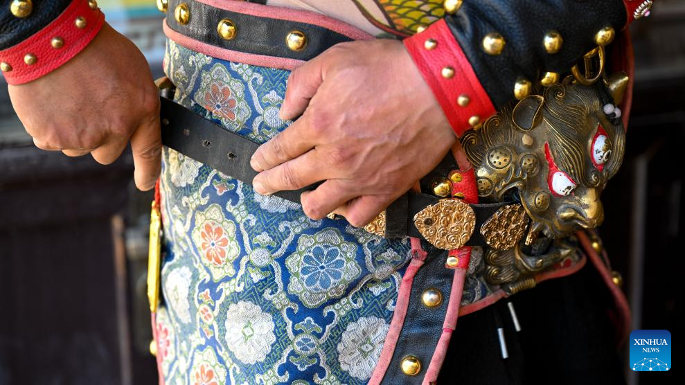 Li Sen puts on a costume of thick armor at the Jiayu Pass scenic area in Jiayuguan City, northwest China's Gansu Province, July 14, 2023.