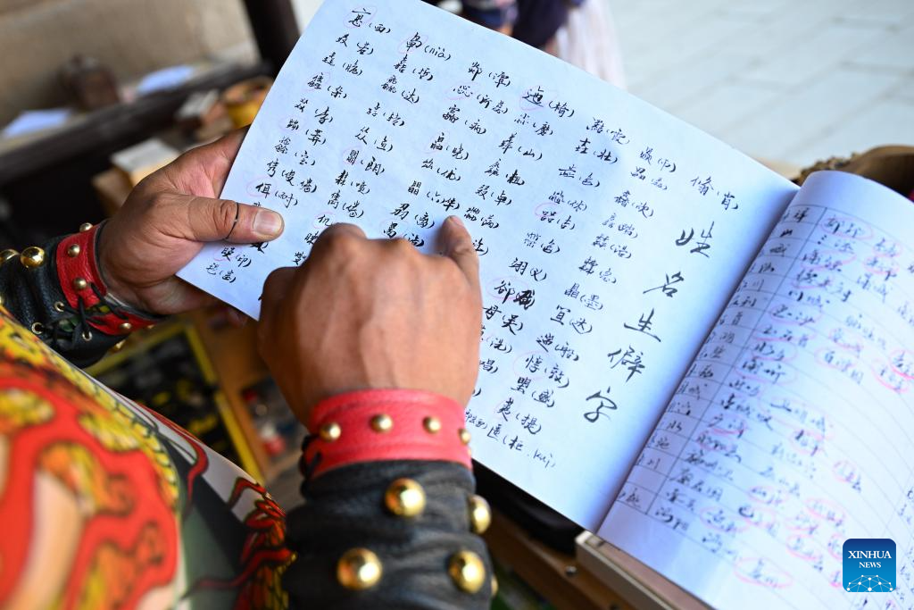 Li Sen checks a handwritten booklet at his stall at the Jiayu Pass scenic area in Jiayuguan City, northwest China's Gansu Province, July 14, 2023.