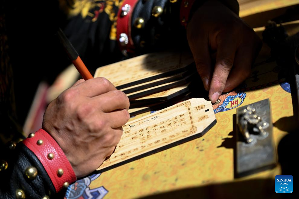Li Sen makes an ancient "visa" for visitors at the Jiayu Pass scenic area in Jiayuguan City, northwest China's Gansu Province, July 13, 2023.