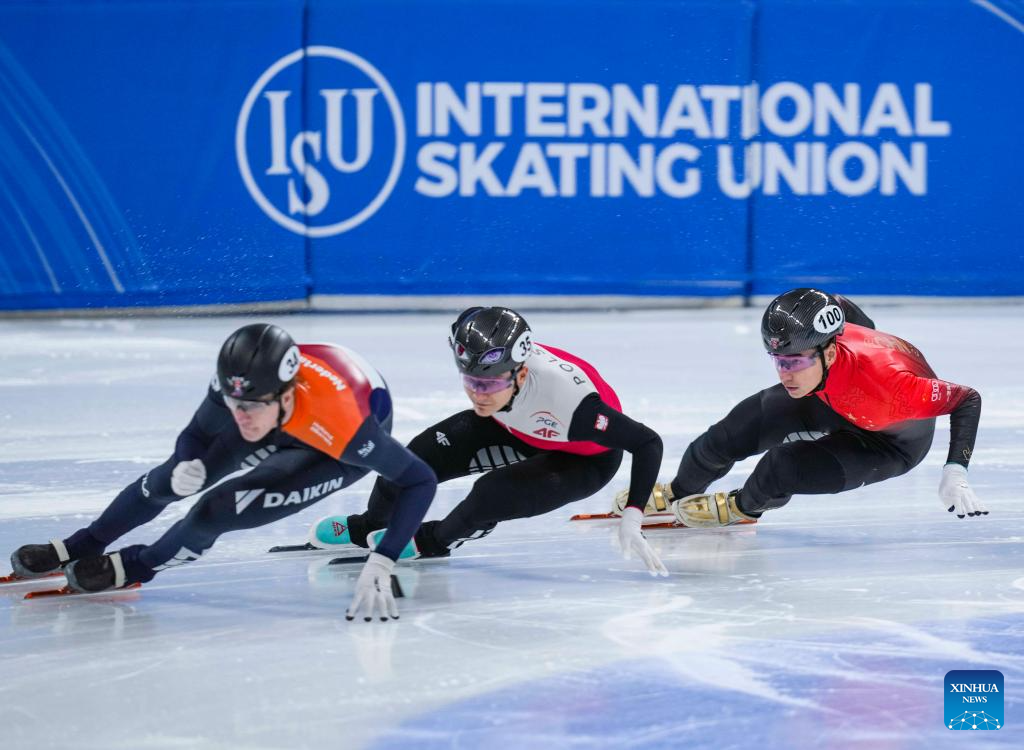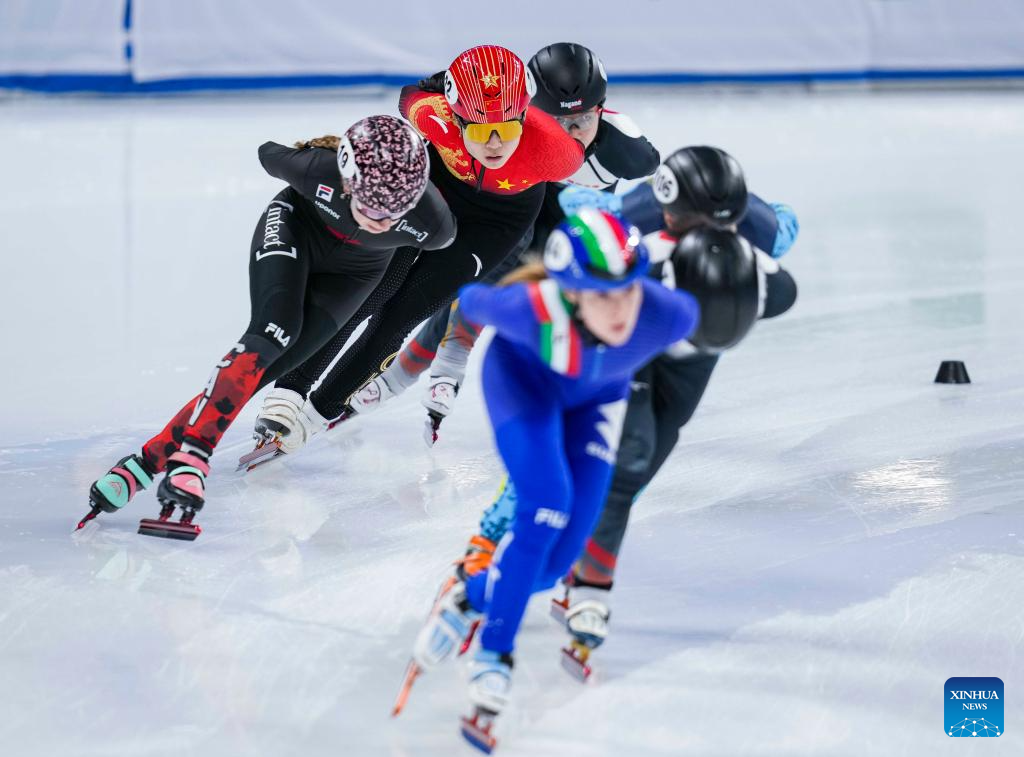 Gong Li (2nd L) of China competes during the women's 1500m quarterfinal at the ISU World Cup Short Track Speed Skating series in Beijing, China, Dec. 8, 2023. (Xinhua/Sun Fei)