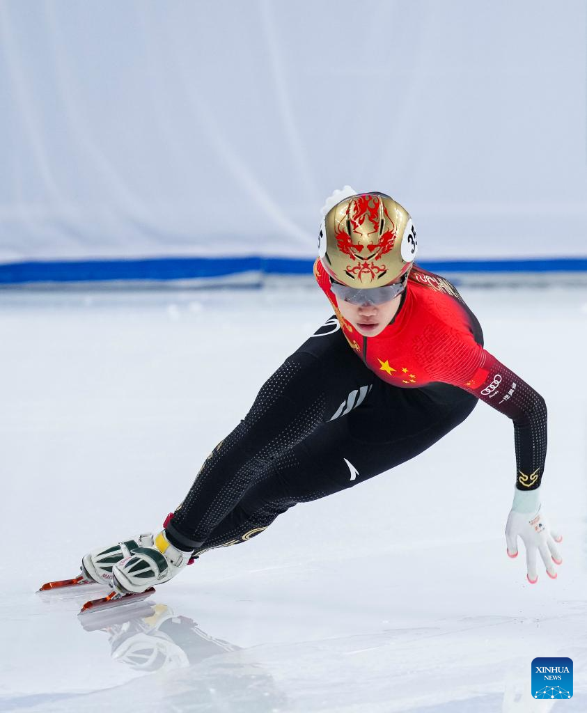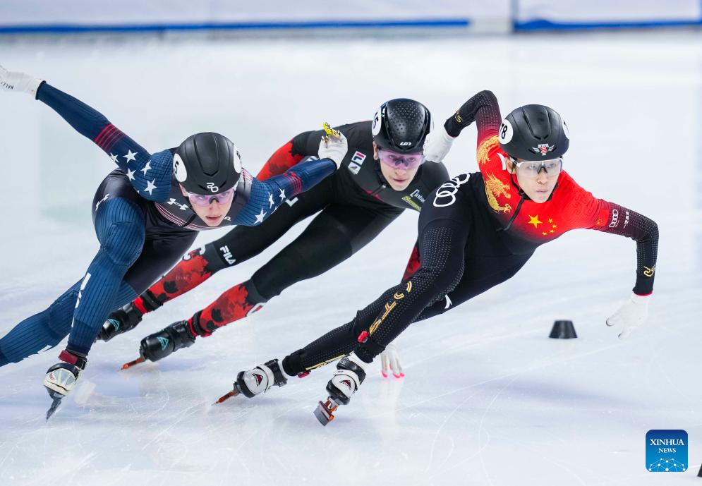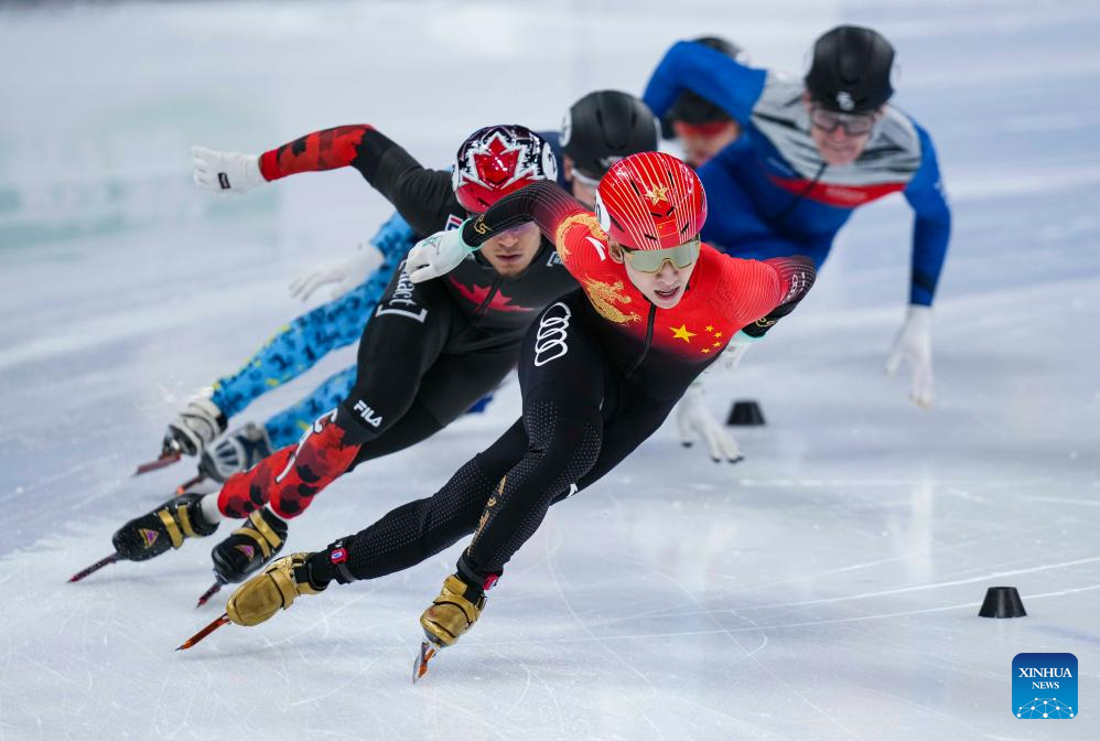 Lin Xiaojun (front) of China competes during the men's 500m heat at the ISU World Cup Short Track Speed Skating series in Beijing, China, Dec. 8, 2023. (Xinhua/Sun Fei)