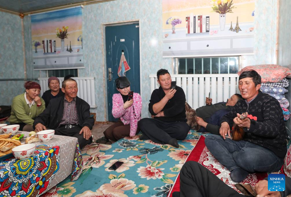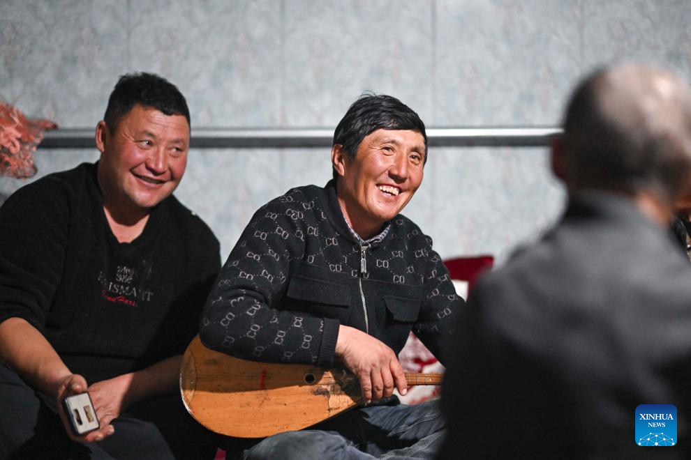 Baht's brother (1st R) plays dombra and sings a song praising the pasture in Yumin County, northwest China's Xinjiang Uygur Autonomous Region, Nov. 30, 2023. (Xinhua/Hu Huhu)