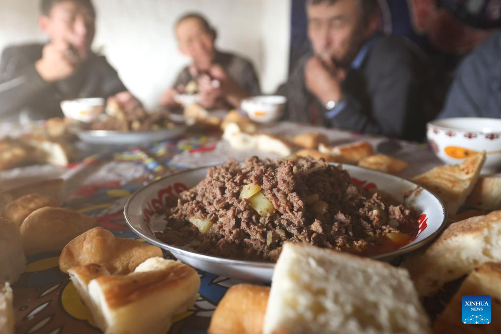 This combo photo shows guests eating steamed beef at Baht's home in Yumin County on Nov. 30, 2023 (above) and Baht's youngest daughter sharing foods sent by her mother with her friends at Xinjiang Medical University on Dec. 3, 2023 (bottom) in northwest China's Xinjiang Uygur Autonomous Region. (Xinhua/Hu Huhu)