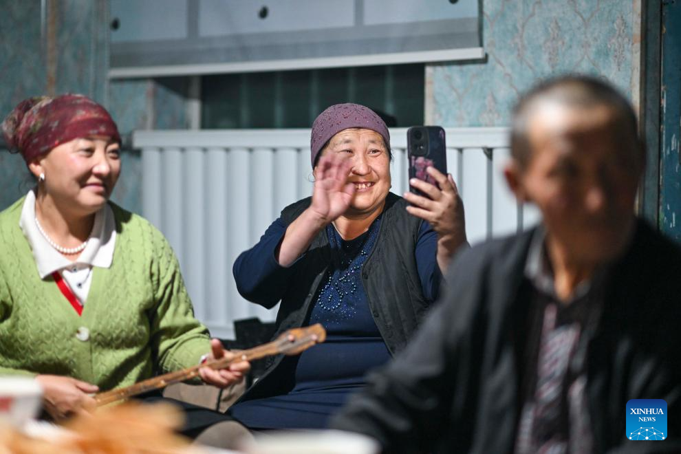 Relatives of Baht chat and sing during a gathering in Yumin County, northwest China's Xinjiang Uygur Autonomous Region, Nov. 30, 2023. (Xinhua/Hu Huhu)