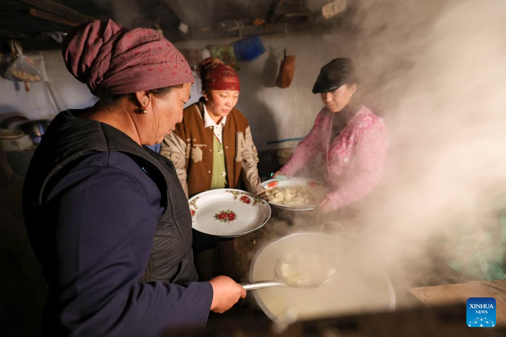 Baht's eldest daughter (R) and sister-in-law prepare food for guests in Yumin County, northwest China's Xinjiang Uygur Autonomous Region, Nov. 30, 2023. (Xinhua/Hu Huhu)