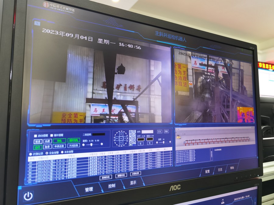 A screen displays the images delivered by a robot patrolling the main slope at Malan coal mine of Shanxi Coking Coal Xishan Coal Electricity Group Co., Ltd. in Gujiao City, north China's Shanxi Province, Sept. 4, 2023. (Xinhua/Wang Xuetao)