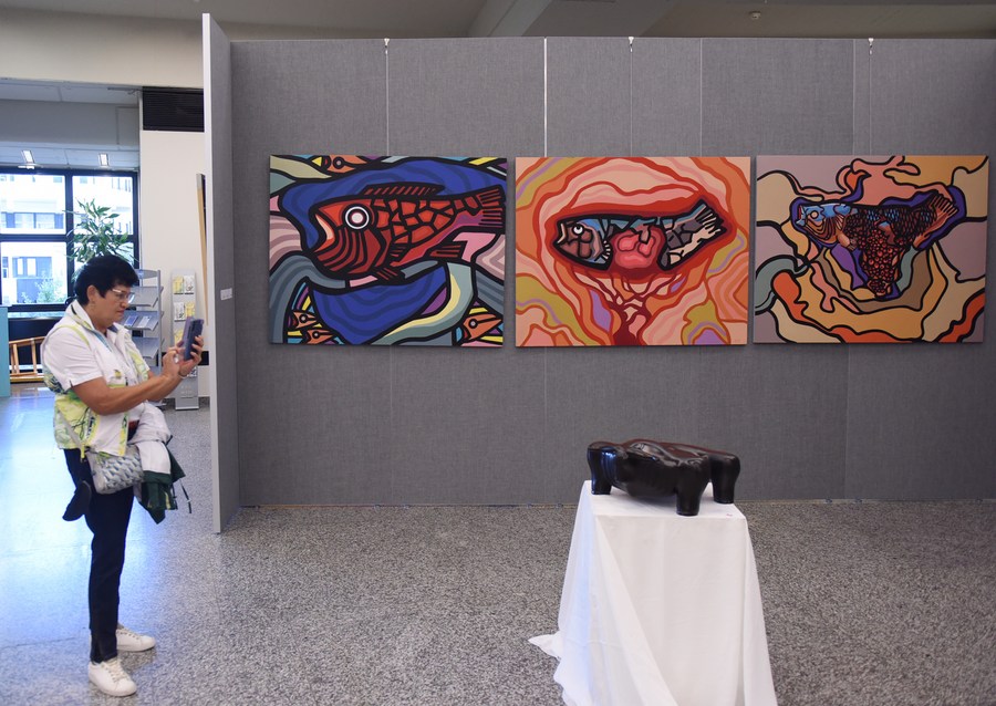 A visitor takes photos of an exhibit during the 3rd China-Europe International Art Biennial in Vienna, Austria, on Oct. 6, 2023. (Xinhua/He Canling)