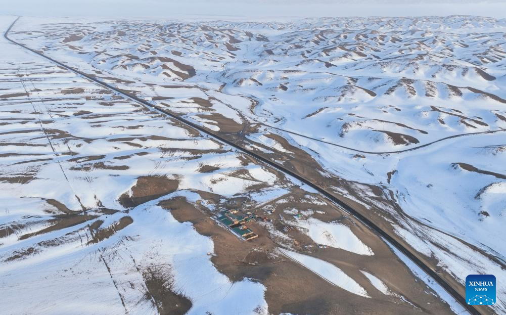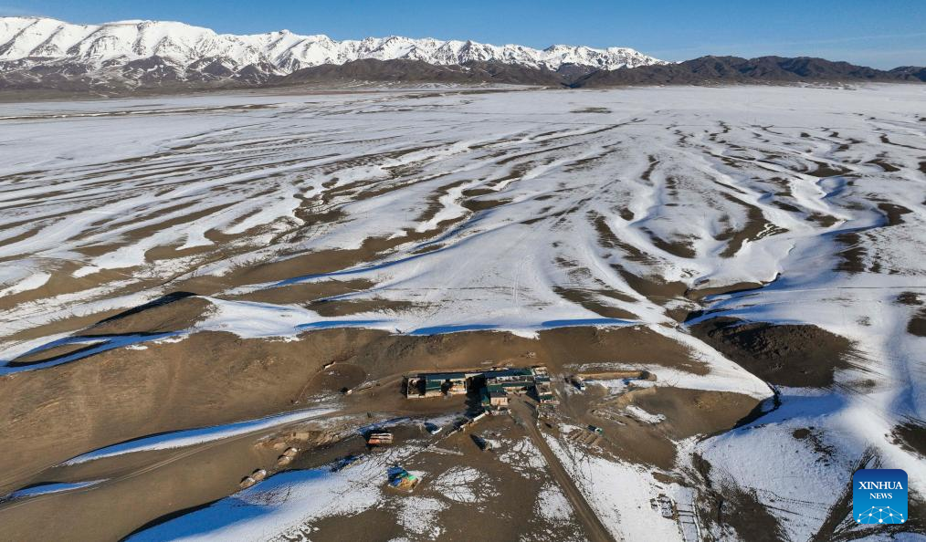 This aerial photo taken on Dec. 1, 2023 shows the residence of Baht Turlksi's family at a winter pasture, at the foot of the Baluke Mountain, in Yumin County, northwest China's Xinjiang Uygur Autonomous Region. (Xinhua/Hu Huhu)